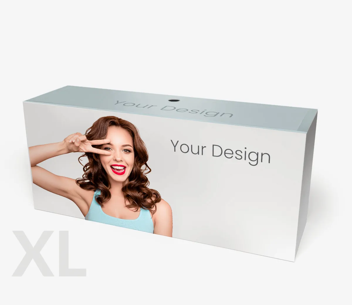 Cardboard Table XL is a substantial and striking promotional furniture piece made from durable EB-flute corrugated cardboard, with a top protected by clear 3 mm plexiglass. Its generous surface area and full UV-print customization make it an excellent solution for product display at trade shows, events, and in-store promotions. It works equally well as a branded booth element or a functional presentation base.