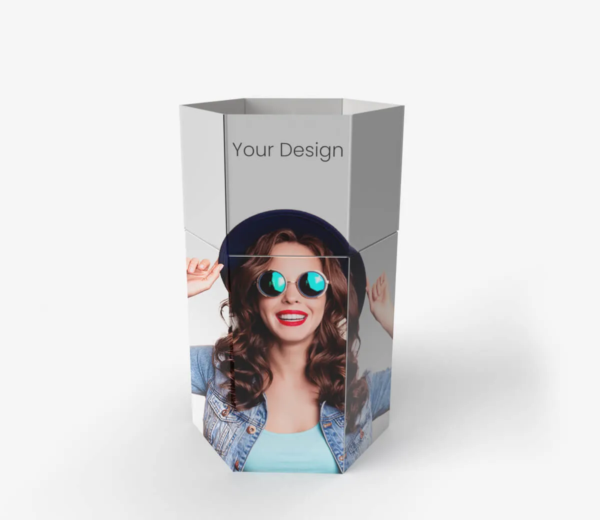 The bin can be personalized with any promotional graphic using UV printing (semi-matte), delivering rich color and detail without additional varnishing or lamination. It ships flat-packed and is designed for quick, tool-free assembly, easing both transport and storage.