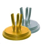 Solid stand for representative interiors such as offices, public institutions and conference halls. The wide Ø 360 mm base in powder-coated steel provides stability, while four Ø 28 × 1 mm sleeves securely hold Ø 25 mm poles. Available in two classic finishes: gold or silver.