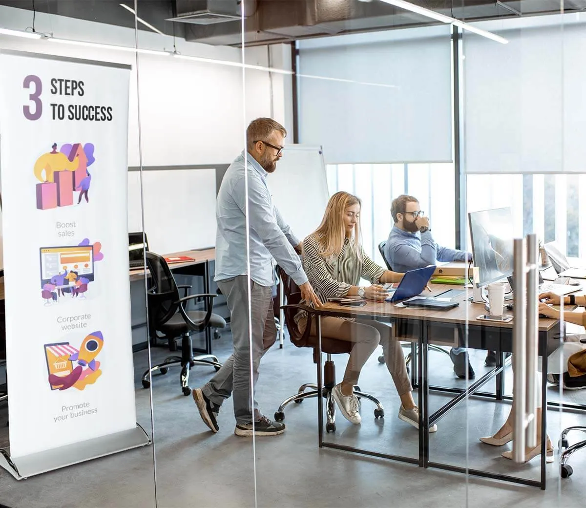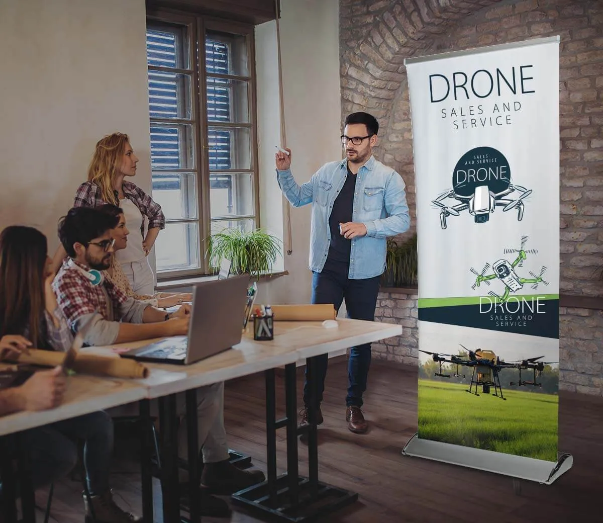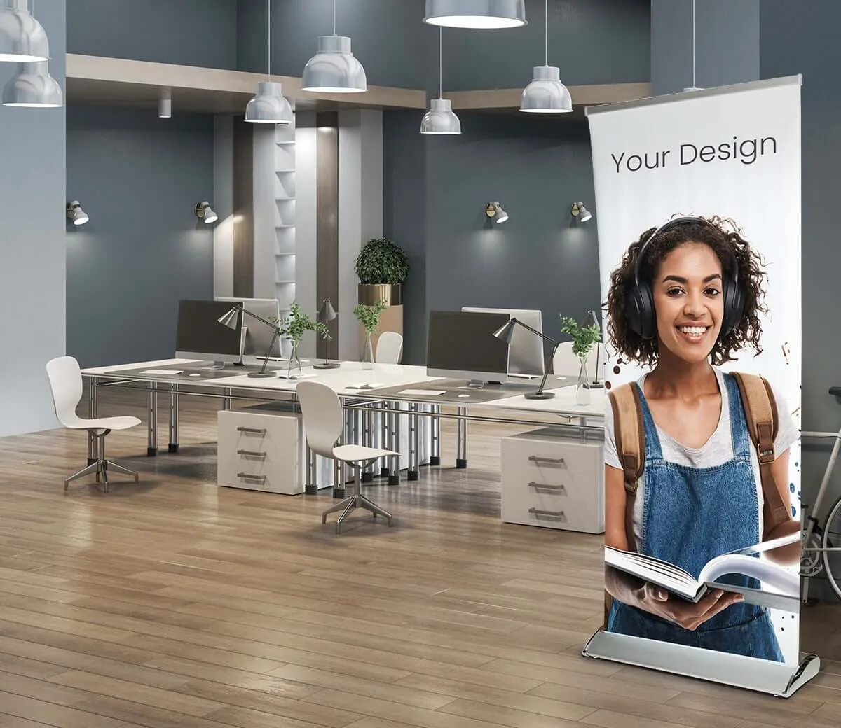 Media & printing — choose Blockout 440 g/m² (fully opaque, saturated colours) or specialised roll-up film for smooth winding/unwinding without creases. Printing with UV or solvent HR ensures precise detail and long-lasting colours. A stiffening/top rail keeps the banner flat and neatly tensioned.